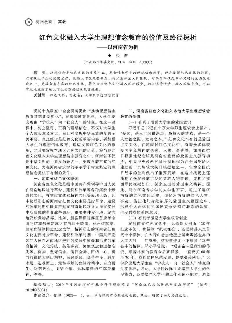 摘要:理想信念是红色文化的重要内容。要加强大学生的理想信念教育,理应发挥红色文化的作用以增强大学生的爱囯意识,激励大学生艰苦创业,树立集休主义价值观。河南省不仅是中华文明的主要发源地之一,更蕴含着丰富的红色文化。将河南省红色文化融入思政课堂,融入课外活动,融入网络平台,可以有效地提高本地大学生的理想信念教育效果。