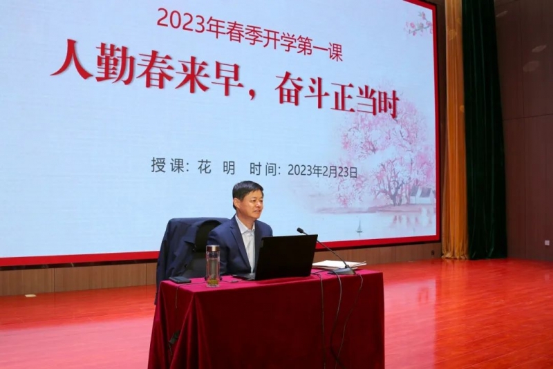 2月23日下午,在河南医学高等专科学校公共艺术中心报告厅,学校党委书记花明以《人勤春来早 奋斗正当时》为题,讲授2023年春季学期“开学第一课”。