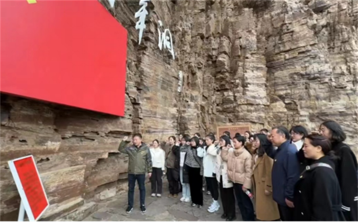 在讲解员的引导下,老师们沿着565米长的展线,依次参观了“千年旱魔 时代抗争——红旗引领 创造奇迹——英雄人民 太行丰碑——山河巨变 实现梦想——继往开来 精神永恒”五个主题展,一幅幅图片、一件件实物,一段段感人事迹,生动再现了林县人民在中国共产党的领导下历时十年在太行山腰修建全长1500公里被称为“人工天河”的红旗渠的伟大壮举,再现了林县人民战太行、出太行、富太行、美太行的动人史实。通过参观学习,老师们为林县人民不认命、不服输、战天斗地“重新安排林县河山”的英雄气概和大无畏精神所感动,更加深刻理解了“自力更生、艰苦创业、团结协作、无私奉献”的红旗渠精神的深刻内涵和时代价值。随后,老师们走“红飘带”,登“水长城”,前往红旗渠咽喉工程——青年洞参观,亲身感受红旗渠工程的宏伟与感悟修建红旗渠的艰辛,并在青年洞前重温入党誓词。