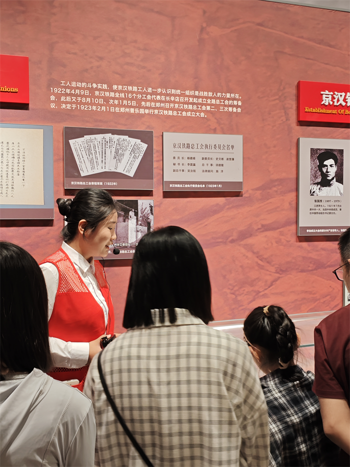 讲解员们以饱满的热情、生动鲜活地为前来参观游览的游客介绍“劳动者文物”,如:京汉铁路装卸工的起卸服、京汉铁路总工会会员证、《京汉工人流血记》等;讲述京汉铁路的修建、在党的领导下开展的“反帝、反封建”的二七工人运动始末以及革命先烈的英勇事迹等。讲解过程中,志愿讲解员积极与参观者互动交流,通过沉浸式讲解带领参观者一起触摸历史传播红色文化,参观者无不被革命先烈的精神所打动,讲解员的讲解也获得高度肯定。参加本次活动的讲解员们纷纷表示收获颇丰。