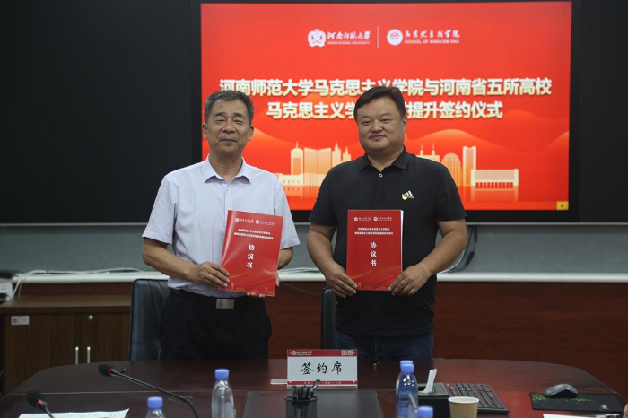 蒋占峰代表河南师范大学与五所高校马克思主义学院进行结对提升签约。大家纷纷表示将以此次结对提升为契机,取长补短,在教学、科研、社会服务等方面加强交流合作,汇聚资源合力,夯实合作根基,共同助推马克思主义学院内涵式发展。协议明确了在教学资源共享、师资培训与交流、科研项目合作等多方面展开深度合作。